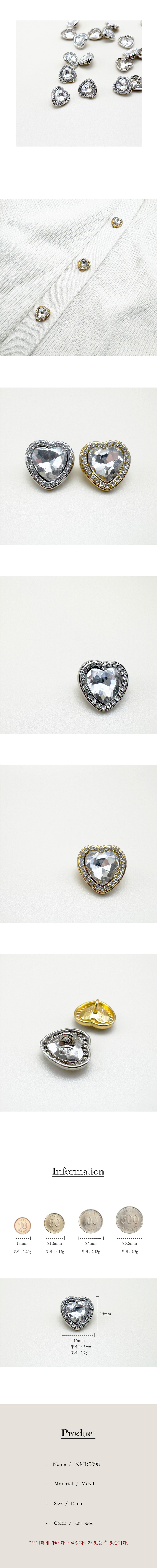 큐빅 스톤 하트 금속단추 15mm