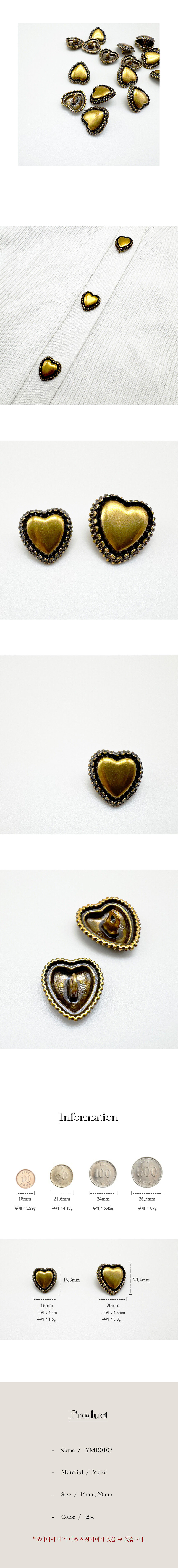 엔틱 하트 빈티지 금속단추 16mm,20mm